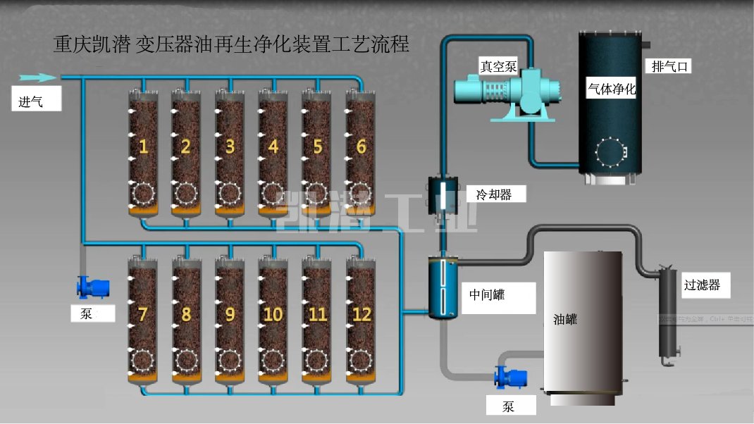 重慶凱潛工業變壓器絕緣油再生裝置結合國內外_先進變壓器絕緣油再生處理工藝,既能除去劣質的變壓器油酸值、氧化物、積碳、烴、氫、乙炔、開關油中的酸性成分、懸浮物質、沉淀物質,能使劣質的變壓器油、開關油再生利用。